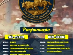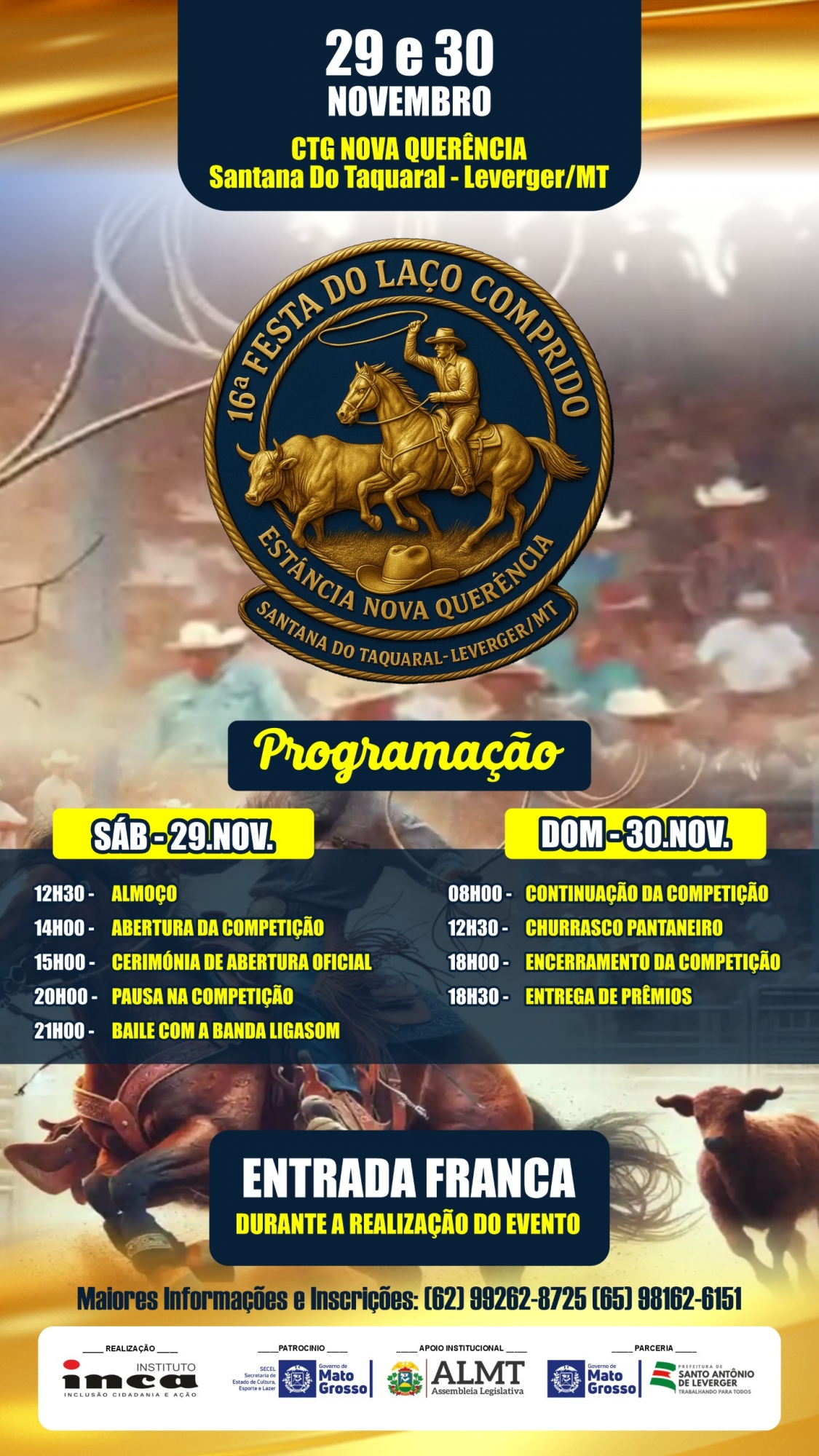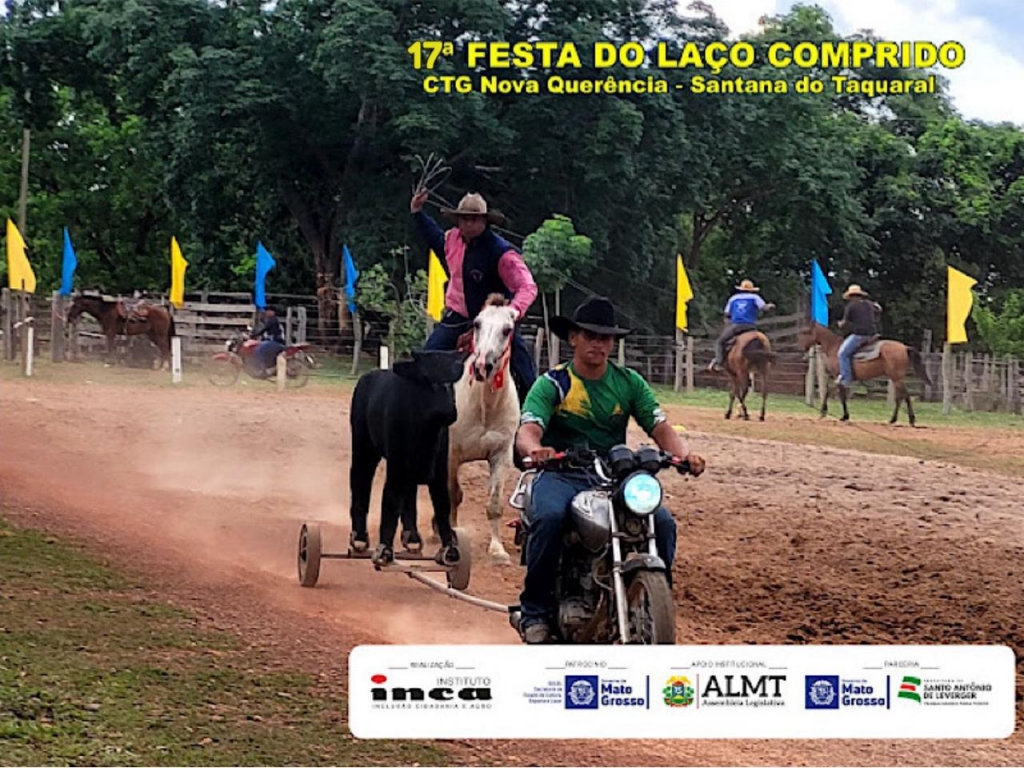 Nos dias 29 e 30 de novembro, a Baixada Cuiabana está convidada para a 17ª edição da Festa do Laço Comprido da Estância Nova Querência, no CTG Nova Querência, na Comunidade Santana do Taquaral (a 100 Km de Cuiabá), localizada no município de Santo Antônio do Leverger. Um evento com entrada e show gratuito da banda de lambadão Ligasom e promete ser diferenciado, com transmissão ao vivo. O evento une a tradição gaúcha e a mato-grossense na disputa com montaria a cavalo, para laçar a vaca mecânica, e concorrer a 14 premiações em dinheiro. São esperados até 100 competidores com comitivas de Santo Antônio de Leverger, Barão de Melgaço, Cuiabá, Campo Verde, Jaciara, Várzea Grande, Poconé e Barra do Bugres.