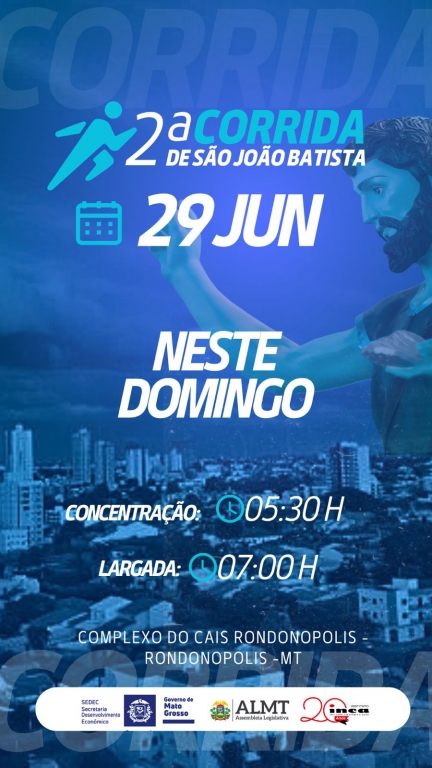 Os amantes pela corrida de rua vivenciarão, no próximo dia 29 de junho, a 2ª Corrida “São João Batista”, no município de Rondonópolis (MT), em um percurso de 5km de pura adrenalina, bem-estar e saúde, em um encontro de corredores profissionais e amadores, amigos e familiares que se juntam em uma festa esportiva nas principais vias do centro da cidade concorrendo a grandes premiações. Com largada e chegada no complexo do Cais, um dos espaços simbólicos local, a corrida é aberta a 700 participantes de ambos os sexos, abrangendo diversas faixas etárias, com idades a partir de 14 anos.