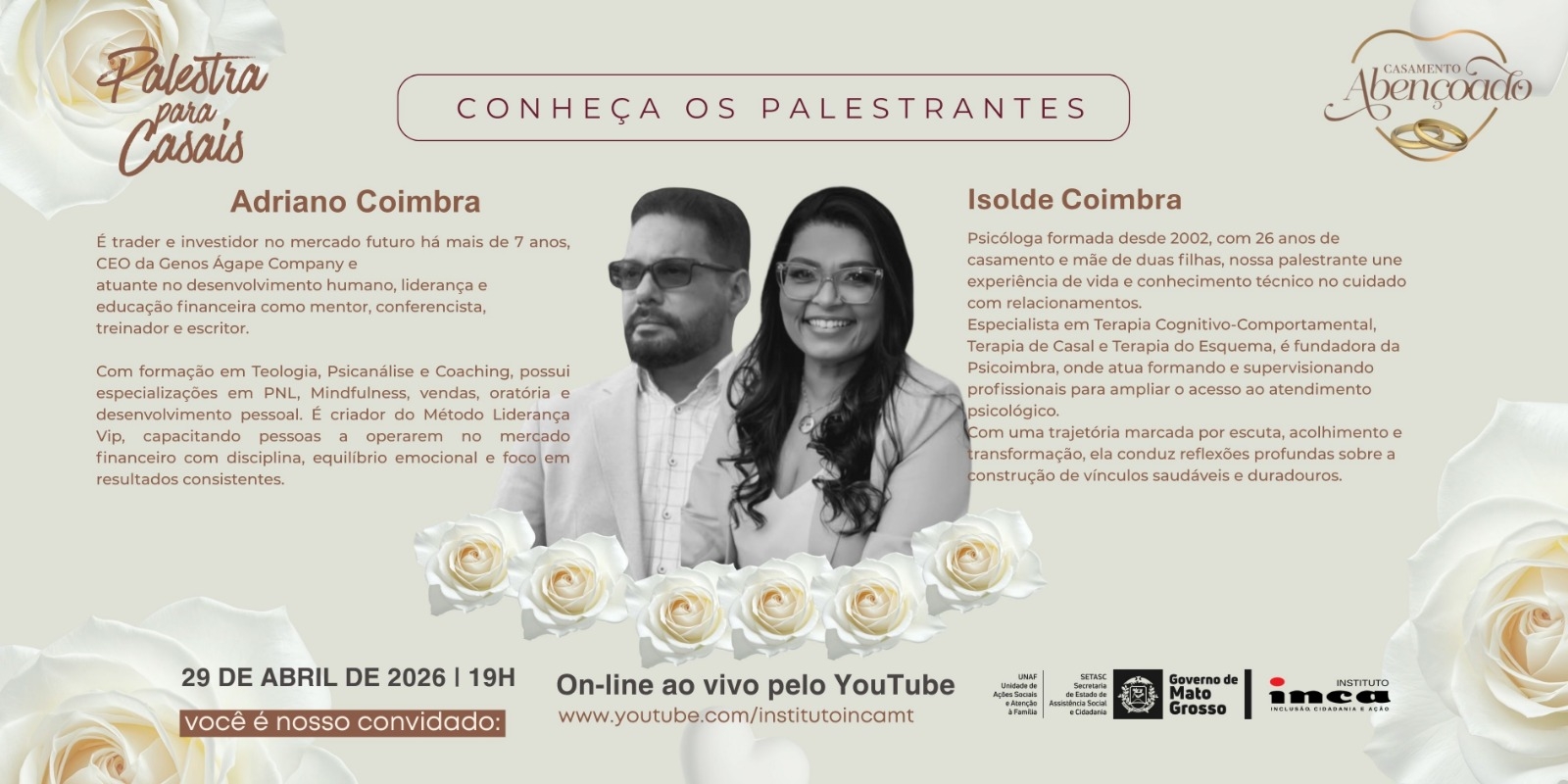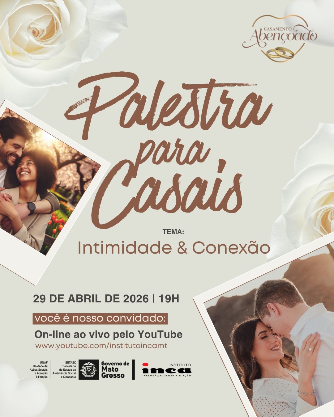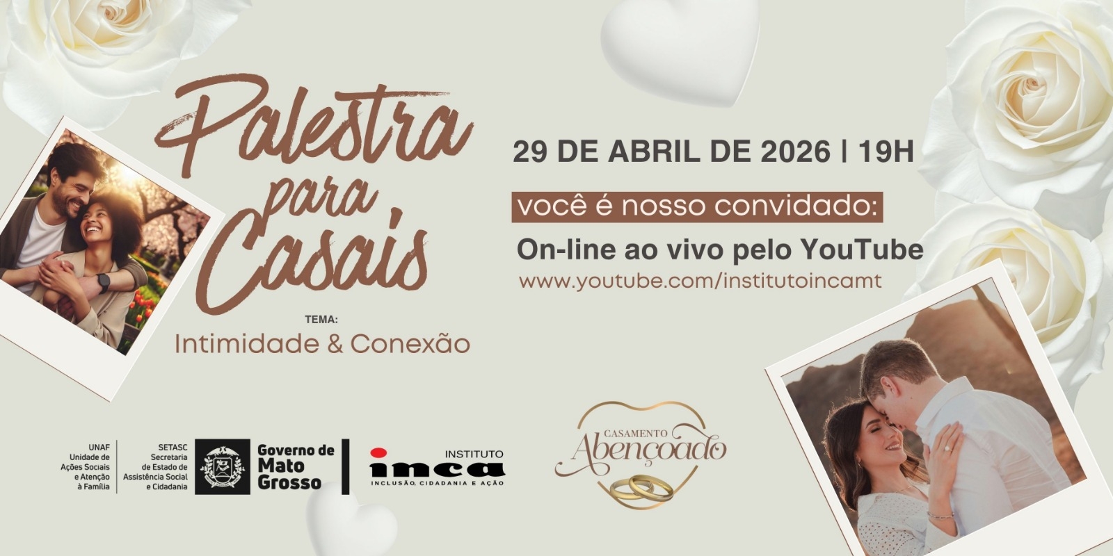O Casamento Abençoado 2026 – Vale do Rio Cuiabá segue depois do sim! Os casais que participaram da edição 2026, realizada em fevereiro (22), serão beneficiados com um ciclo de três palestras, que começa nesta quinta-feira (29 de abril). E o melhor é que será aberta ao público geral, transmitida pelo canal do Youtube do Instituto INCA-Inclusão, Cidadania e Ação. O tema da primeira edição é “Intimidade e Conexão: Como evitar o distanciamento emocional”, com os psicólogos Isolde e Adriano Coimbra.
