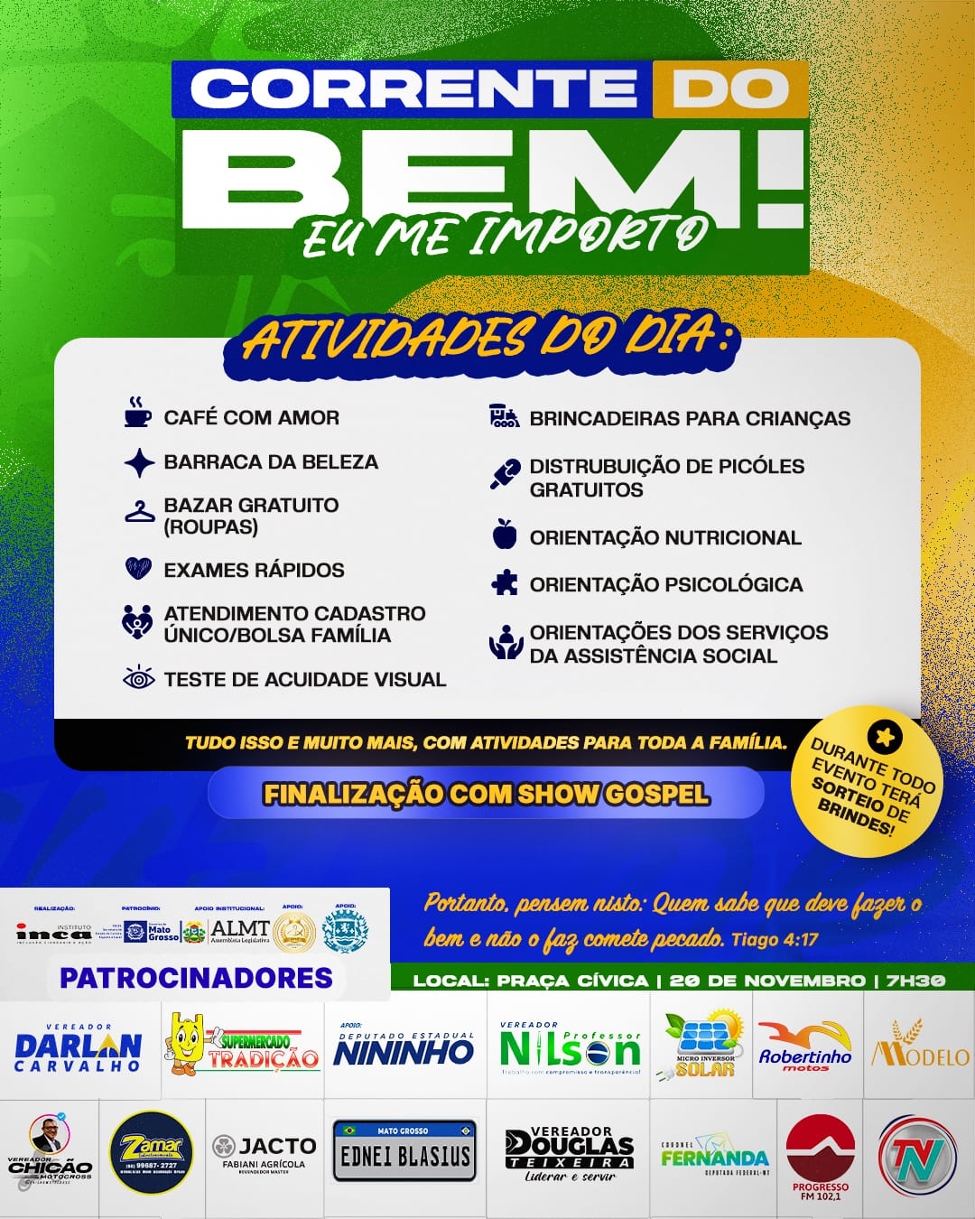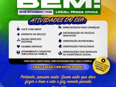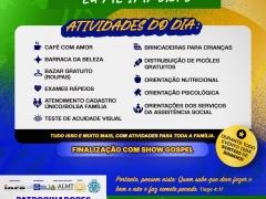 O evento começa às 19h com ministração e o louvor. Na programação também terão shows gospel e a “Corrente do Bem”, com atividades de assistência social pelo CRAS, que inclui o Café da Manhã; Barraca da Beleza; Bazar Gratuito (roupas); exames rápidos; atendimento do Cadastro Único/Bolsa Família; teste de acuidade visual; brincadeiras para as crianças distribuição gratuita de picolés e brindes; orientação nutricional; orientação psicológica; orientações dos serviços da Assistência Social, e muito mais.