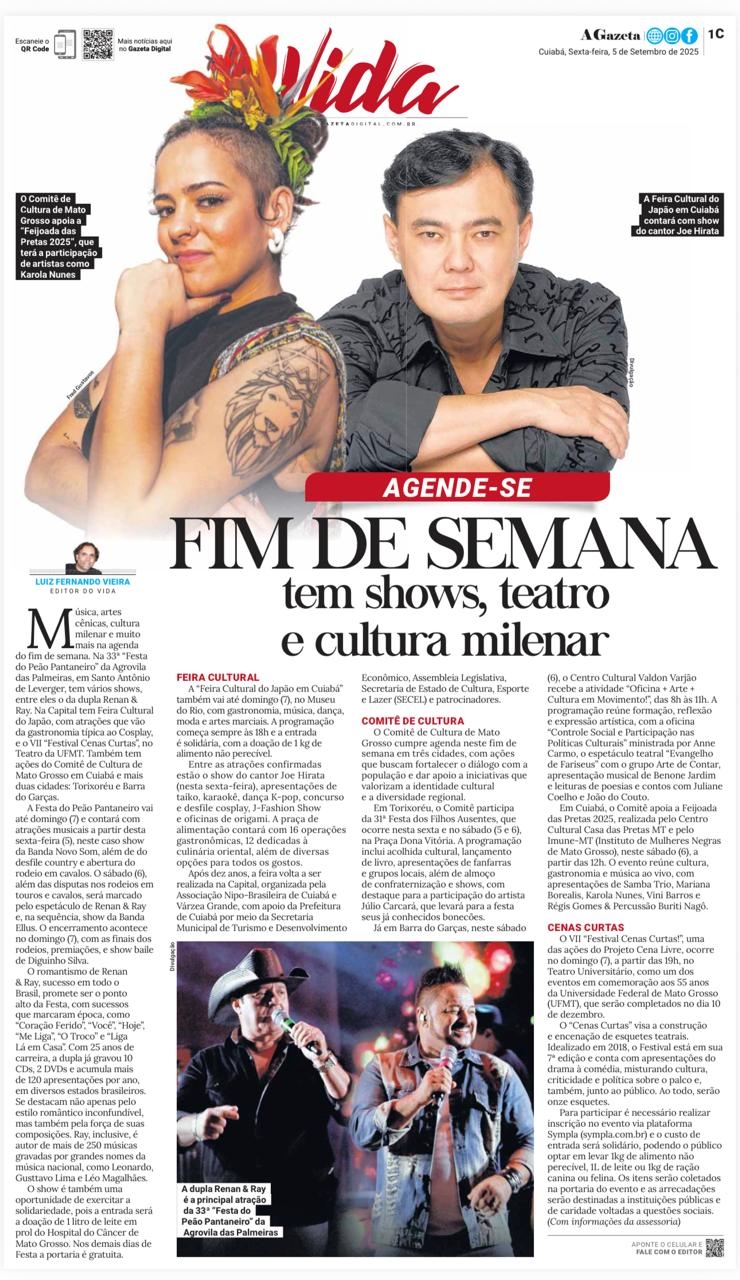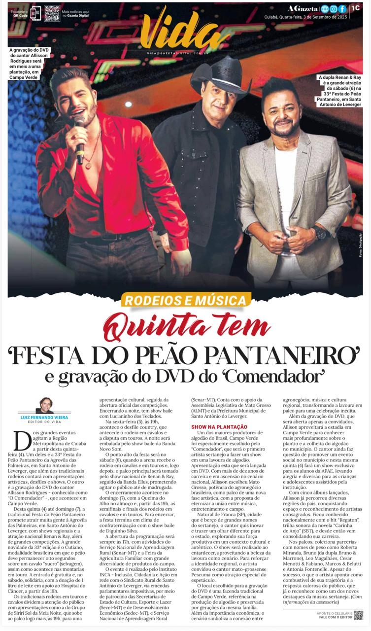 Também integraram a agenda cultural o “Arraiá da Cidadania”, que atendeu mais de 27 mil pessoas com serviço e lazer, e se tornou referência em sustentabilidade com destinação correta de resíduos; a “33ª Festa do Peão Pantaneiro de Agrovila”, com recorde de inscrições, rodeio inédito em cavalos, oficinas, palestras e show nacional de Renan & Ray; a “Vaquejada de Acorizal”; os “39 anos do bairro Três Barras”; a “Marcha para Jesus”, em Alta Floresta; o “Miss Mato Grosso Oficial 2025”; a “17ª Festa do Laço Comprido de Mato Grosso”; e o Natal do Amor, em Rondonópolis, com decoração inédita assinada por Célio Corrêa.